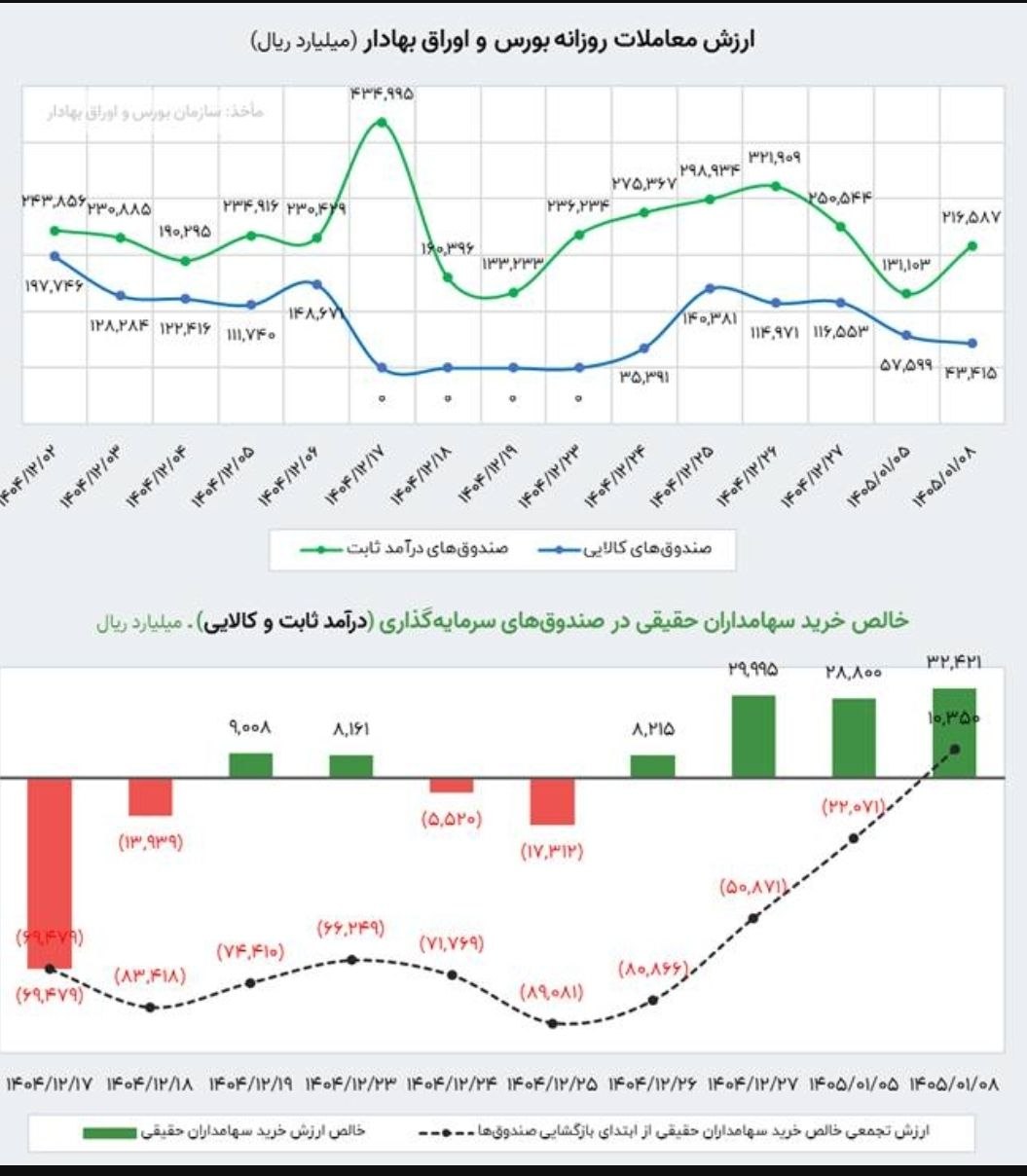 در معاملات روز شنبه 8 فروردین 1405، بازار سرمایه شاهد تغییر مسیر جریان نقدینگی بود. اقبال گسترده سهامداران حقیقی به صندوقهای درآمد ثابت، خالص خرید آنها را در بازار به مثبت 1 همت (هزار میلیارد تومان) رساند. از مجموع 26 همت ارزش معاملات روزانه صندوقها، 21.7 همت به صندوقهای درآمد ثابت اختصاص داشت. این در حالی است که صندوقهای کالایی با خروج پول حقیقیها مواجه شدند.