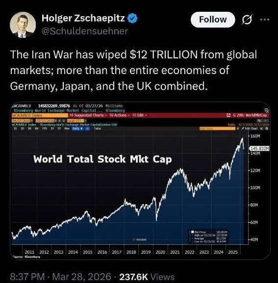 پیامدهای اقتصادی ناشی از حمله آمریکا به ایران، منجر به کاهش 12 تریلیون دلاری ارزش بورس‌های جهانی شده است. یک تحلیلگر بازارهای مالی آلمانی با اعلام این آمار، ابعاد تکان‌دهنده این زیان را تشریح کرد. این رقم عظیم از مجموع ارزش کل اقتصادهای 3 قدرت بزرگ صنعتی یعنی آلمان، ژاپن و بریتانیا نیز فراتر می‌رود. این موضوع نشانگر آسیب‌پذیری شدید بازارهای مالی در برابر تنش‌های ژئوپلیتیکی است.