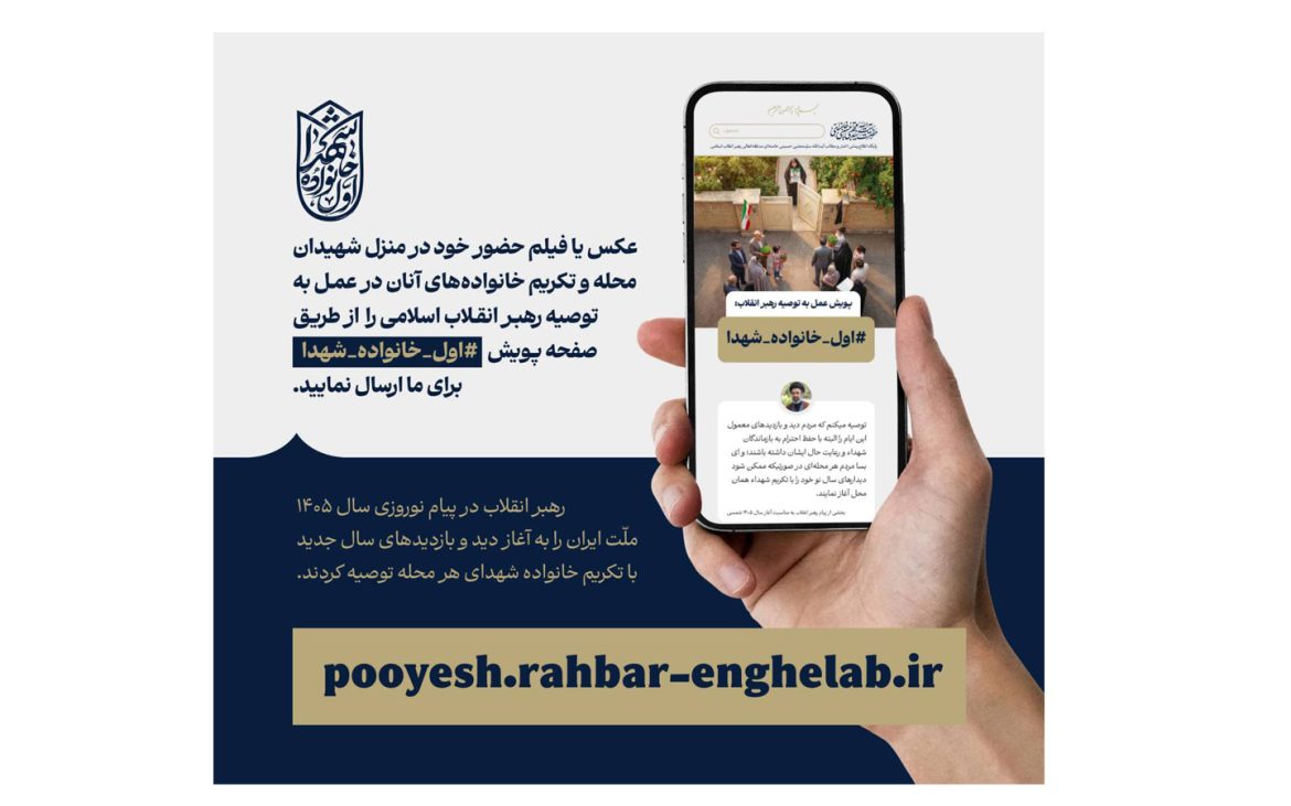 در پاسخ به توصیه رهبر معظم انقلاب در پیام نوروزی سال 1405، پویش ملی #اول_خانواده_شهدا آغاز به کار کرد. این پویش از عموم ملت ایران دعوت میکند تا در دید و بازدیدهای سال جدید، تکریم خانواده شهدای محله خود را در اولویت قرار دهند. شرکتکنندگان میتوانند با ارسال عکس یا فیلم از این دیدارها، در این حرکت فرهنگی مشارکت کنند.
