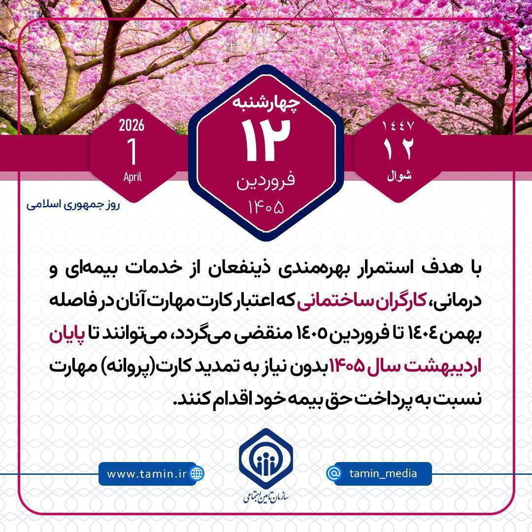 در راستای حمایت از کارگران ساختمانی و استمرار پوشش خدمات بیمهای، تسهیلات ویژهای در نظر گرفته شد. بر اساس این تصمیم، کارگران ساختمانی که اعتبار کارت مهارت آنها در فاصله بهمن 1404 تا فروردین 1405 به پایان میرسد، فرصت دارند تا پایان اردیبهشت 1405 حق بیمه خود را بپردازند. این اقدام به آنها اجازه میدهد بدون نیاز به تمدید فوری کارت مهارت، از ادامه خدمات بیمه و درمان بهرهمند شوند.