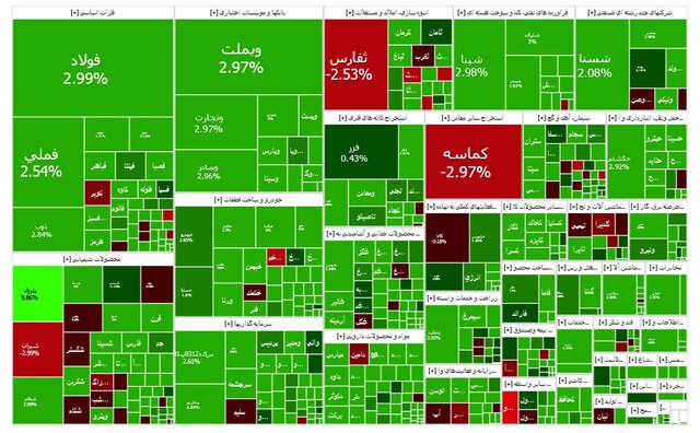 فولاد، فملی و فارس به ترتیب بیشترین تاثیر مثبت را بر شاخص بورس داشتند. از نمادهای پرتراکنش نیز میتوان به فولاد، کماسه و ذوب اشاره کرد.