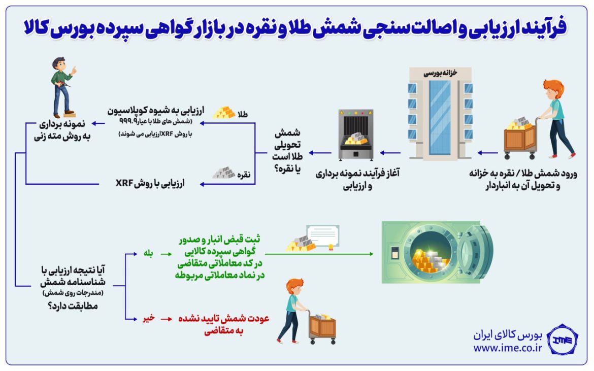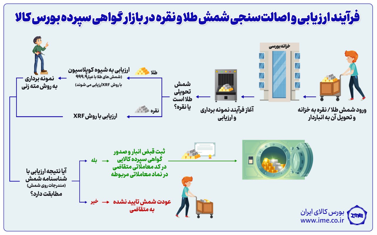 خرید طلا یا نقره از بستر بورس کالا به این دلیل امن است که اصالت و عیار شمشهای قابل معامله در بدو ورود به خزانه فلزات گرانبها، مورد ارزیابی قرار میگیرد و در صورت تایید، قبض انبار در سامانه ثبت و گواهی سپرده آن به نام متقاضی و در کد معاملاتی او صادر میشود.