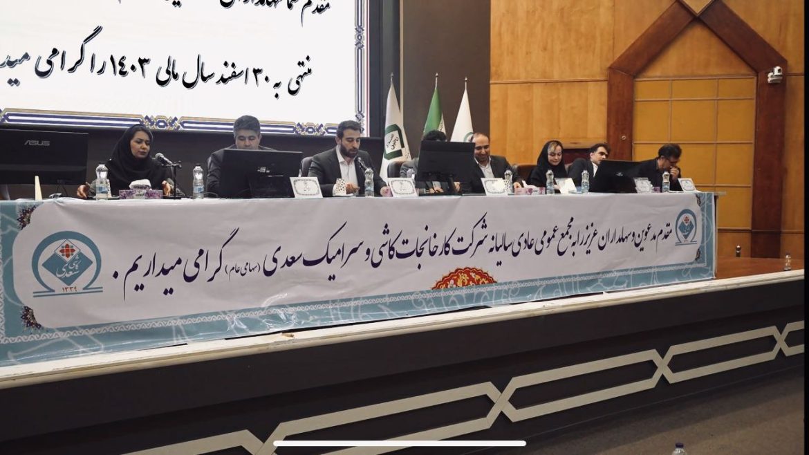 مجمع عمومی عادی سالیانه شرکت کارخانجات کاشی و سرامیک سعدی برای سال مالی منتهی به ۳۰ اسفند ۱۴۰۳ روز سهشنبه ۱۳ خرداد ۱۴۰۴ برگزار شد. در این نشست با حضور ۵۷ درصد از سهامداران حقیقی و حقوقی، صورتهای مالی شرکت به تصویب رسید و تقسیم سود نقدی به میزان ۵۷۰ ریال برای هر سهم تصویب شد.