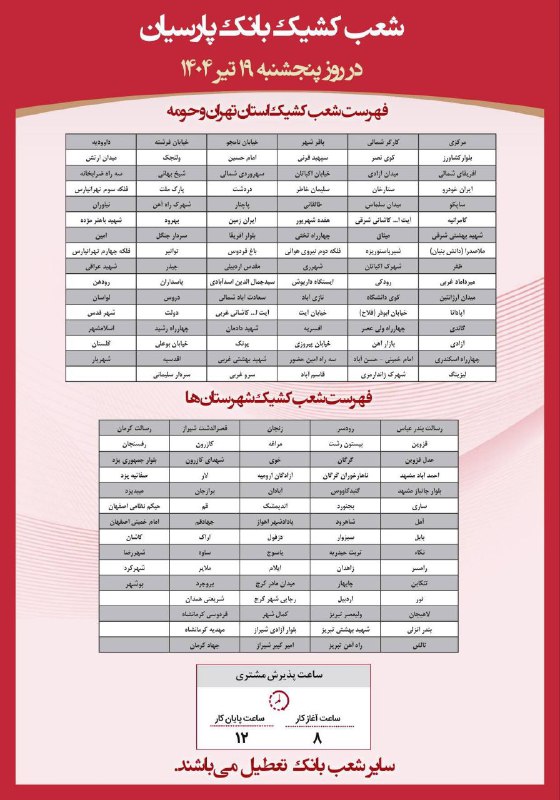 اعلام رسمی فهرست شعب کشیک بانک پارسیان
