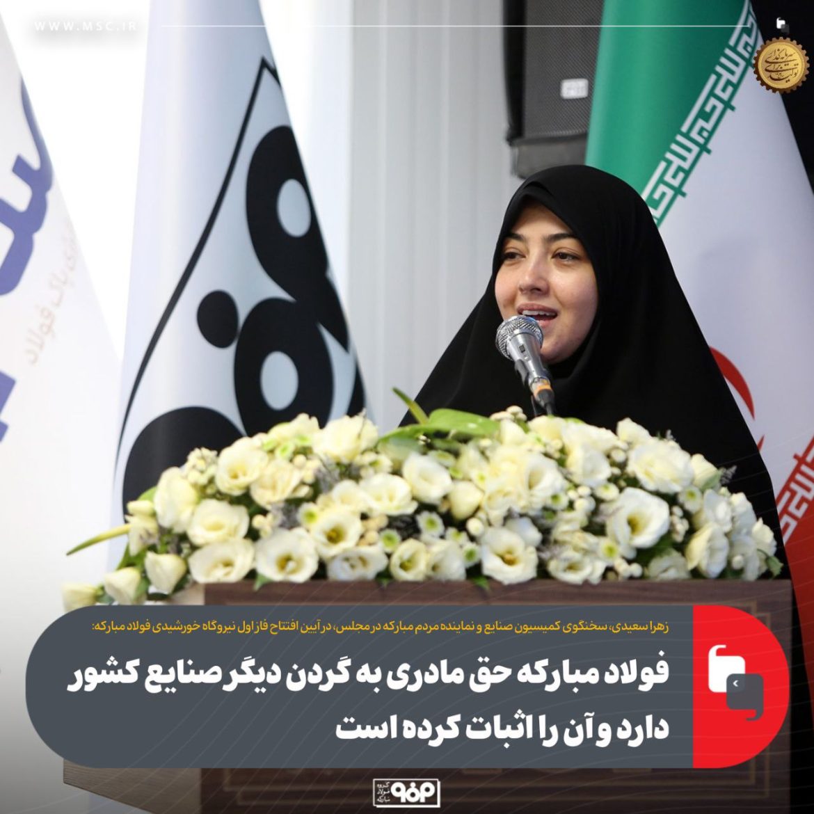 زهرا سعیدی، سخنگوی کمیسیون صنایع و معادن مجلس، در مراسم افتتاح فاز اول نیروگاه خورشیدی فولاد مبارکه، این مجموعه را دارای حق مادری بر گردن صنایع کشور دانست. او اظهار داشت گروه فولاد مبارکه در عمل مادری خود را اثبات کرده است و شهرستان مبارکه نیز به مثابه پسر بزرگ این مادر است. وی صنعت و معدن را ویترین نظام جمهوری اسلامی ایران توصیف کرد و حفظ این ویترین در هر شرایطی را امری واجب خواند.