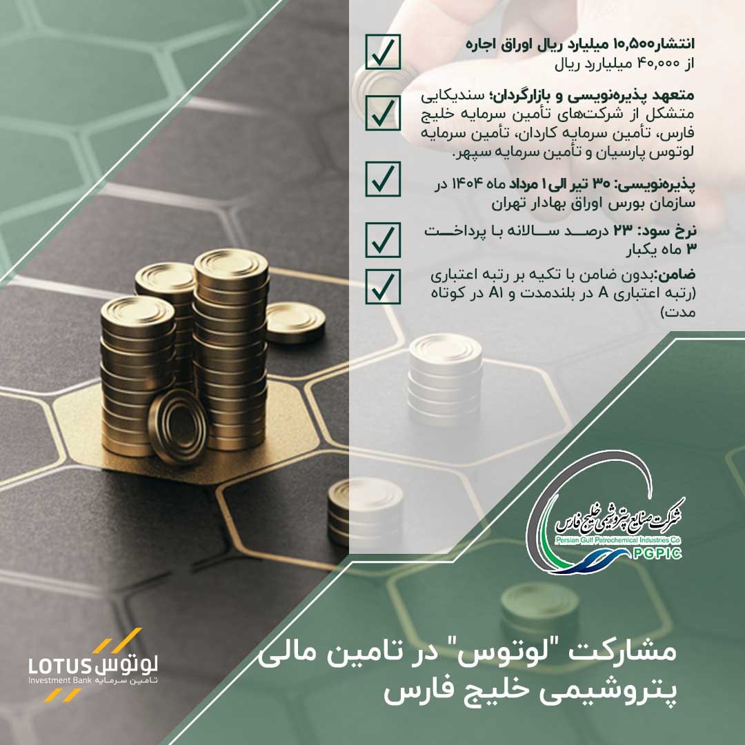 شرکت تأمین سرمایه لوتوس پارسیان به عنوان یکی از نهادهای مالی معتبر، نقش مهمی در این فرآیند ایفا میکند. این شرکت مسئولیت تعهد پذیرهنویسی و همچنین بازارگردانی اوراق اجاره پتروشیمی خلیج فارس را بر عهده گرفته است. این تعهد، اطمینان لازم را برای سرمایهگذاران جهت نقدشوندگی و موفقیتآمیز بودن این عرضه بزرگ در بورس تهران فراهم میآورد.