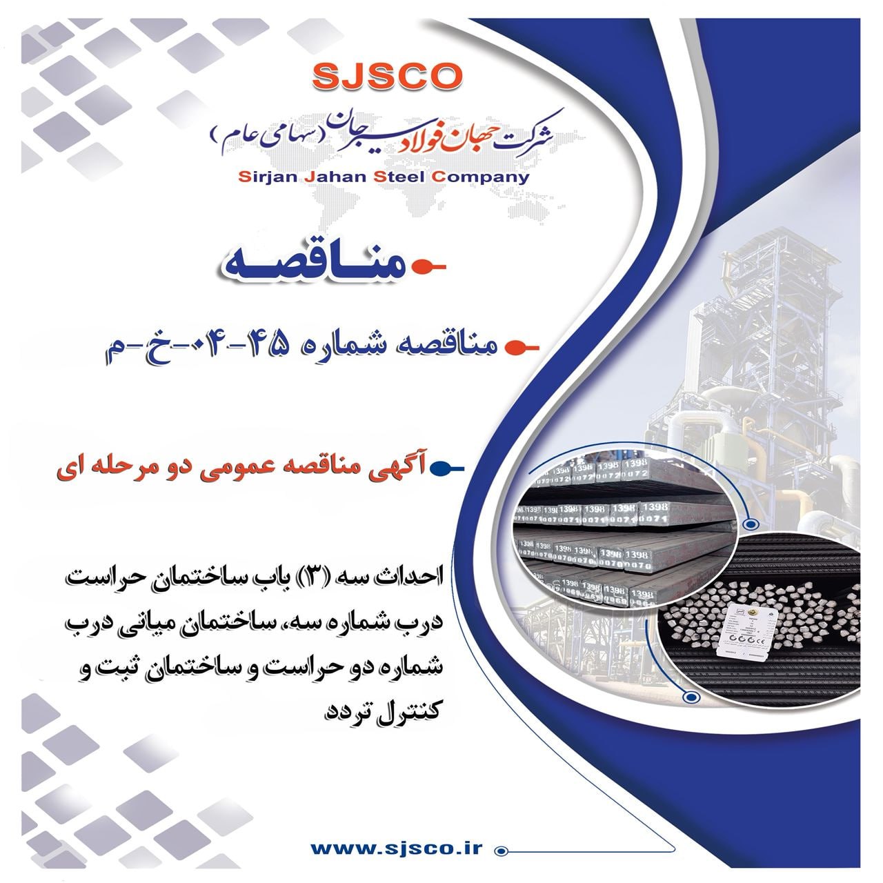 شرکت جهان فولاد سیرجان با انتشار آگهی مناقصه به شماره “45-04-خ-م”، قصد دارد زیرساختهای امنیتی و کنترلی خود را توسعه دهد. این پروژه شامل احداث 3 باب ساختمان مجزا است: ساختمان حراست درب شماره 3، ساختمان میانی درب شماره 2 حراست، و ساختمان ثبت و کنترل تردد. این مناقصه به صورت عمومی و در دو مرحله برگزار خواهد شد تا بهترین پیمانکار برای اجرای این پروژه انتخاب شود.