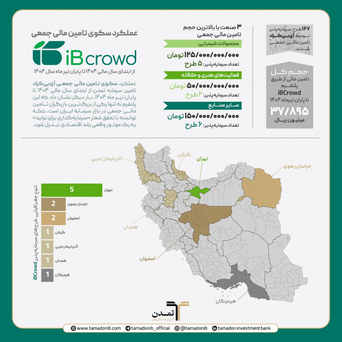 یکی از نقاط قوت کلیدی آیبیکراد در این دوره، تنوع جغرافیایی و صنعتی طرحهای تأمین مالی شده است. این 13 طرح از 7 استان مختلف کشور شامل تهران، اصفهان، خراسان رضوی، همدان، آذربایجان غربی، گیلان و هرمزگان انتخاب شدهاند. همچنین حوزههای فعالیت این طرحها نیز بسیار گسترده بود و بخشهایی مانند محصولات شیمیایی، صنایع خلاق و ماشینآلات را در بر میگرفت. تجارت عمدهفروشی، محصولات غذایی و تجهیزات الکترونیکی از دیگر بخشهای تحت پوشش بودند که عمق نفوذ ملی این پلتفرم را نشان میدهد.