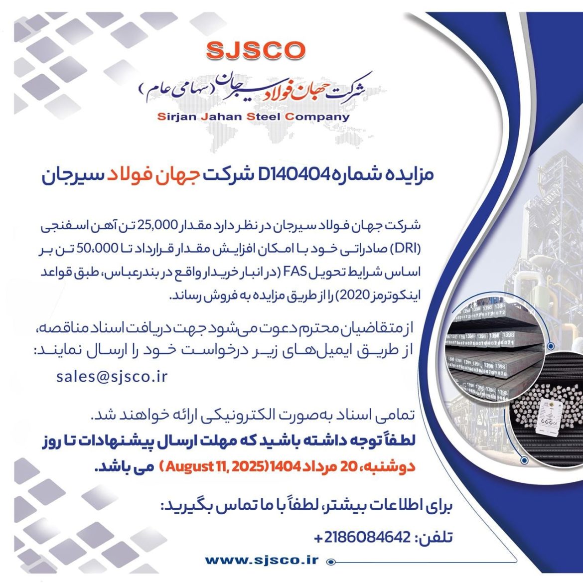 شرکت جهان فولاد سیرجان، از تولیدکنندگان مطرح فولاد کشور، با انتشار یک آگهی رسمی، برگزاری مزایدهای برای فروش محصول آهن اسفنجی (DRI) صادراتی خود را اعلام کرد. حجم اولیه محصول در نظر گرفته شده برای این مزایده، 25 هزار تن است. این فرصت برای فعالان بازار بینالمللی و تجاری که به دنبال تأمین این محصول استراتژیک هستند، اهمیت بالایی دارد.