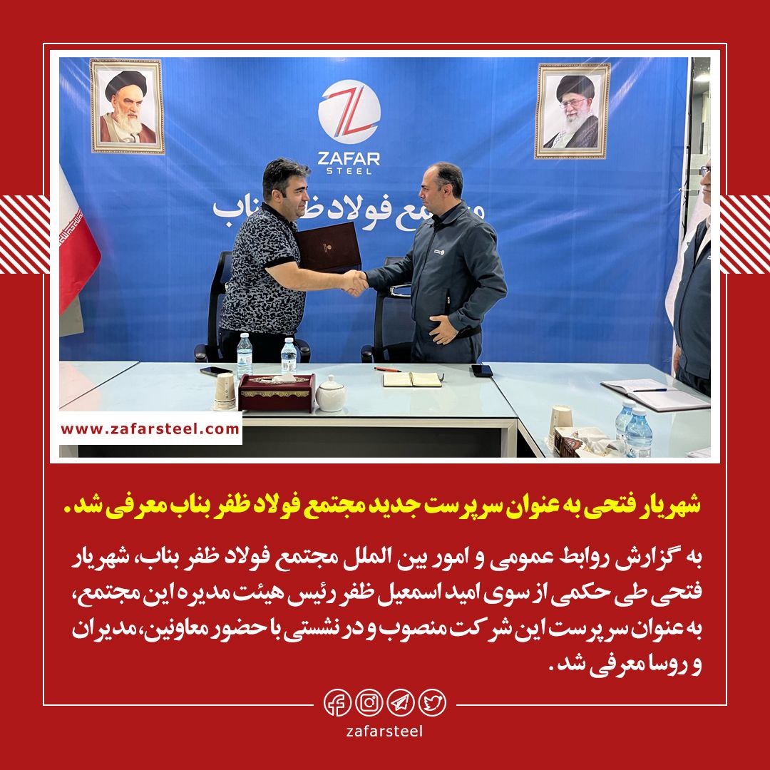 طی حکمی از سوی امید اسمعیل ظفر، رئیس هیئت مدیره مجتمع فولاد ظفر بناب، شهریار فتحی به عنوان سرپرست جدید این شرکت منصوب شد. این انتصاب پس از اتمام قرارداد همکاری بابک علیزاد شهیر، مدیرعامل سابق، صورت گرفت. شهریار فتحی پیش از این سوابق موفقی در مدیریت اجرایی دولتی و همچنین در صنعت فولاد به عنوان مدیرعامل ذوب ظفر و قائم مقام مدیرعامل در همین مجموعه داشته است. هیئت مدیره ابراز امیدواری کرد که با حضور وی، شرکت به اهداف و برنامههای تعریفشده خود دست یابد.