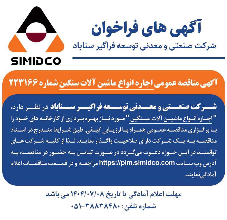 شرکت صنعتی و معدنی توسعه فراگیر سناباد (سیمیدکو) با انتشار آگهی مناقصه عمومی به شماره 223166، فرایندی را برای اجاره انواع ماشینآلات سنگین مورد نیاز کارخانههای خود آغاز کرده است. از تمام شرکتهای پیمانکاری دارای صلاحیت دعوت شده تا با مراجعه به وبسایت این شرکت، آمادگی خود را برای شرکت در این مناقصه که با ارزیابی کیفی همراه است، تا تاریخ 1404/07/08 اعلام نمایند.