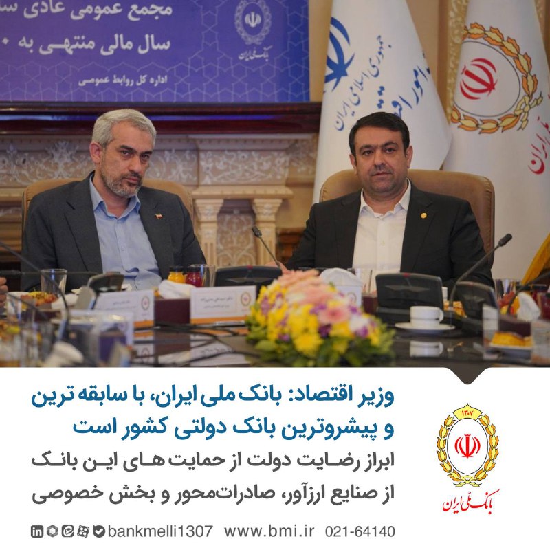 وزیر اقتصاد در مجمع عمومی سالانه بانک ملی ایران، این بانک را پیشروترین بانک دولتی کشور خواند. سید علی مدنیزاده با ابراز رضایت کامل دولت از عملکرد بانک در حمایت از صنایع ارزآور، صادراتمحور و بخش خصوصی واقعی، نقشه راه جدیدی را ترسیم کرد. این نقشه راه بر توسعه تحولی بانکداری دیجیتال، عرضه کارتهای اعتباری خانوار برای تحریک تقاضای هدفمند و مشارکت در پروژههای زیرساختی ملی تاکید دارد. همچنین، وزیر اقتصاد خواستار ممانعت قاطع از پرداخت هرگونه وام به فراریان مالیاتی شد.