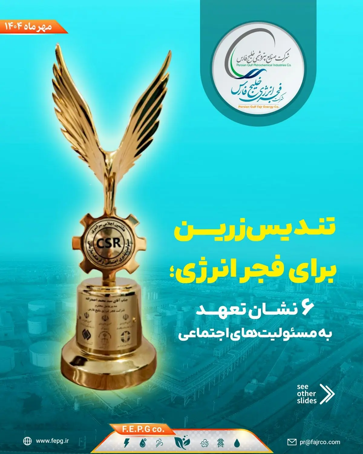 شرکت فجر انرژی خلیج فارس در هشتمین اجلاس سراسری مسئولیتپذیری اجتماعی و فرهنگ سازمانی، بالاترین نشان این رویداد یعنی تندیس زرین را از آن خود کرد. در این مراسم که روز 16 مهرماه در تهران برگزار شد، عملکرد مستند و جامع این شرکت در زمینههای متنوع مورد تقدیر قرار گرفت. فجر انرژی علاوه بر تندیس زرین، موفق به دریافت 6 اعتبارنامه تخصصی تعهد در حوزههای مختلف مسئولیت اجتماعی شد.