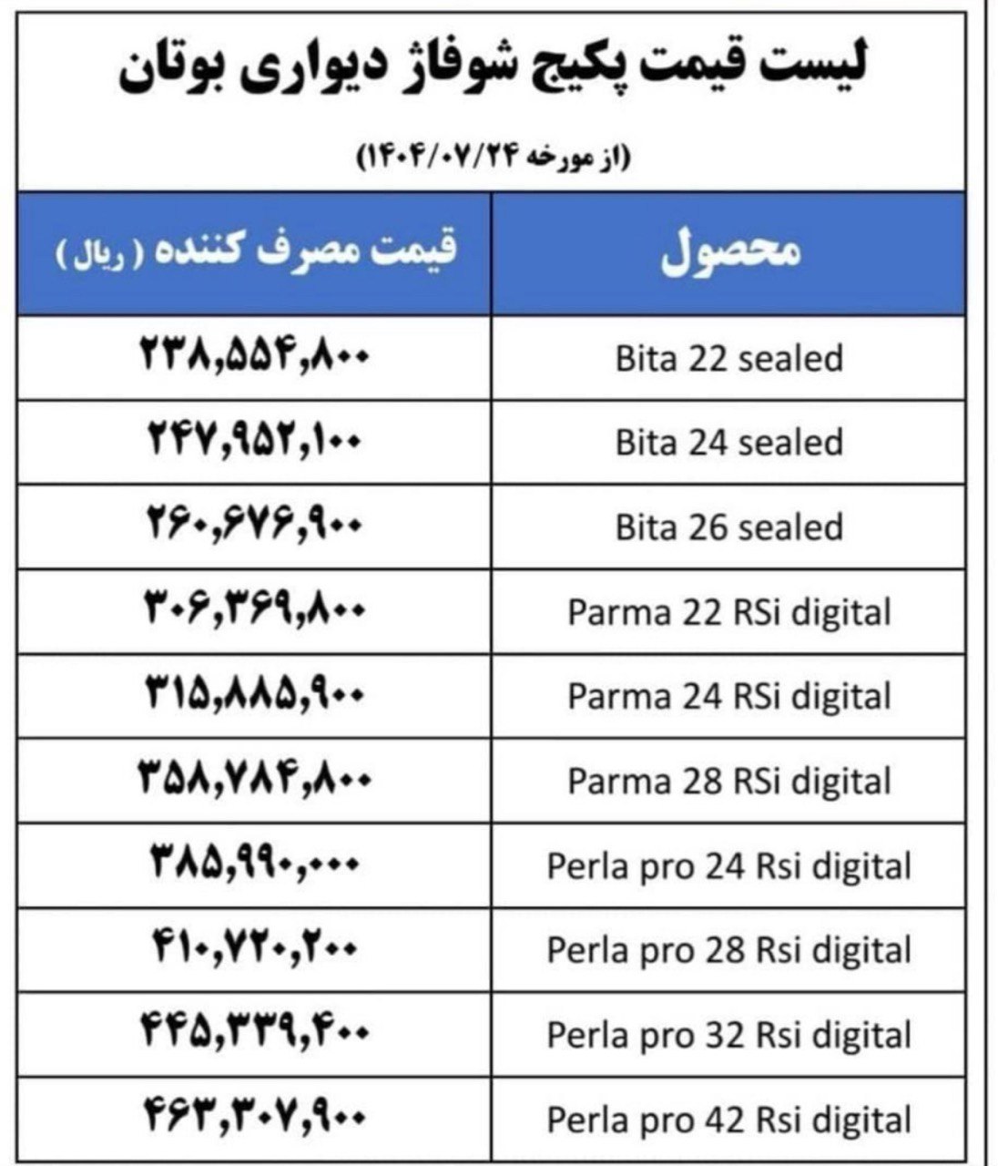 شرکت بوتان لیست قیمت جدید محصولات پکیج شوفاژ دیواری خود را از تاریخ 24 مهرماه 1404 منتشر کرد. این لیست شامل قیمت مصرفکننده برای مدلهای مختلف از سریهای Bita، Parma و Perla pro است. قیمتها از 238,554,800 ریال برای مدل Bita 22 sealed آغاز میشود و تا 463,307,900 ریال برای مدل Perla pro 42 Rsi digital افزایش مییابد. تمامی این محصولات با 24 ماه گارانتی شرکتی به مشتریان عرضه میشوند.