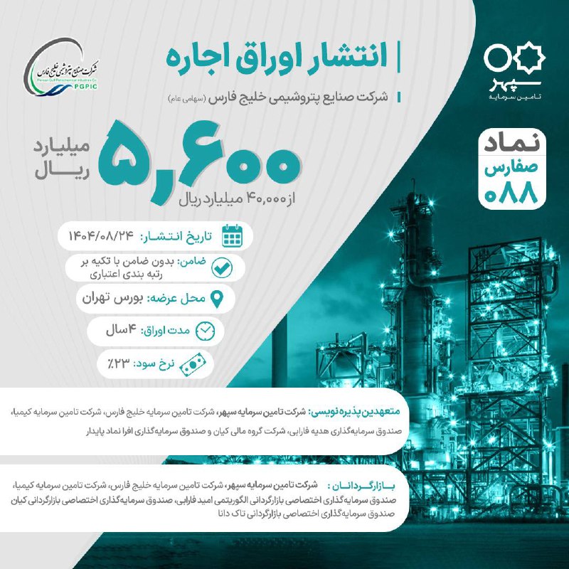 شرکت تامین سرمایه سپهر به عنوان یکی از اعضای اصلی سندیکای پذیرهنویسی، در انتشار مرحله سوم اوراق اجاره شرکت صنایع پتروشیمی خلیج فارس مشارکت میکند. این اوراق به ارزش کل ۴۰,۰۰۰ میلیارد ریال از روز شنبه ۲۴ آبانماه ۱۴۰۴ در بورس تهران عرضه میشود. تعهد تامین سرمایه سپهر در این پروژه بزرگ تامین مالی، مبلغ ۵,۶۰۰ میلیارد ریال است. این اوراق با سود سالانه ۲۳ درصد، سررسید ۴ ساله و پرداختهای ۳ ماهه، فاقد ضامن بوده و بر اساس رتبه اعتباری منتشر میشوند.