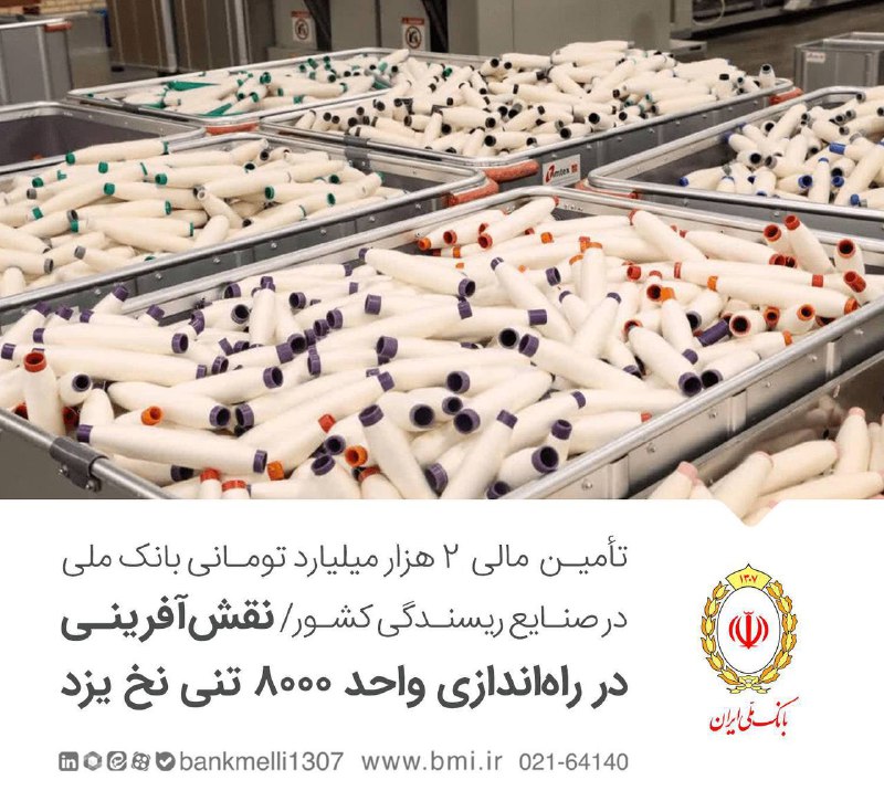 بانک ملی ایران در اقدامی بزرگ جهت احیای صنایع مادر، با تأمین مالی ۲000 میلیارد تومانی، زمینه بهرهبرداری از کارخانه ریسندگی «رسن ریس آریا» در استان یزد را فراهم کرد. این واحد صنعتی پیشرفته با ظرفیت تولید سالانه 8000 تن انواع نخ استراتژیک، نقش حیاتی در تکمیل زنجیره ارزش صنعت پوشاک ایفا میکند. با آغاز به کار این پروژه که با حضور وزیر کشور صورت گرفت، ضمن کاهش وابستگی به واردات مواد اولیه نساجی، اشتغال مستقیم برای 380 نفر از متخصصان و جوانان منطقه ایجاد شد.