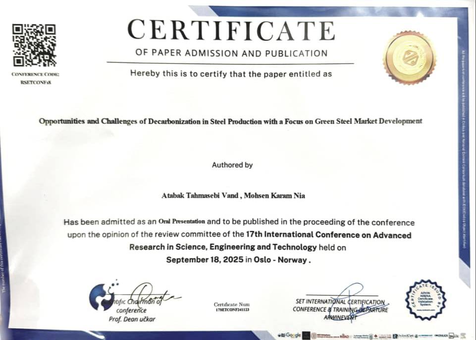 در تاریخ ۲۷ شهریور ماه سال ۱۴۰۴، مصادف با ۱۸ سپتامبر ۲۰۲۵، هفدهمین دوره کنفرانس بینالمللی تحقیقات پیشرفته در علوم، مهندسی و فناوری در شهر اسلو نروژ برگزار گردید. در این رویداد معتبر، مقالهای با عنوان “تحلیل فرصتها و چالشهای مرتبط با موضوع کربنزدایی در تولید محصولات فولادی با تاکید بر توسعه بازار فولاد سبز” ارائه شد. این مقاله حاصل تلاش مشترک اتابک طهماسبیوند از شرکت یاوران فولاد جنوب و محسن کرمنیا، رئیس نت زمزم بخش احیاء شرکت فولاد خوزستان، بود. پس از ارائه، محتوای تحلیلی و نوآورانه این پژوهش با استقبال گسترده هیئت داوران و شرکتکنندگان از سراسر جهان مواجه گردید و پس از ارزیابیهای تخصصی، به عنوان مقاله برتر کنفرانس انتخاب شد.