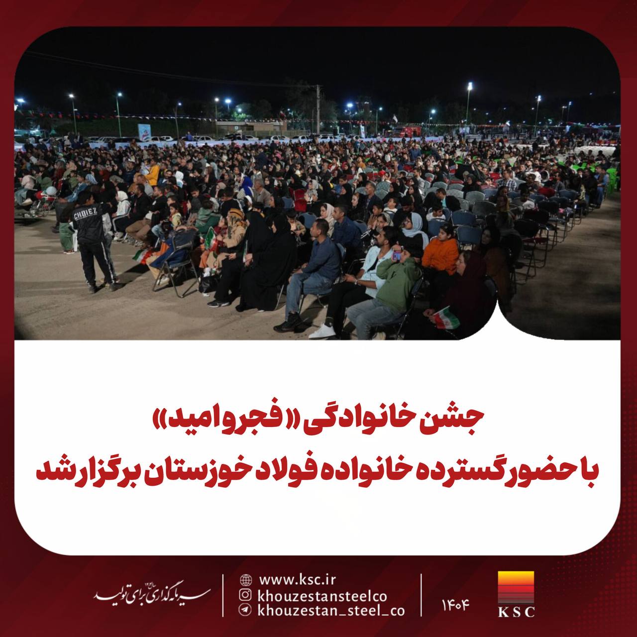 شرکت فولاد خوزستان همزمان با چهلوهفتمین سالگرد پیروزی انقلاب اسلامی، گردهمایی بزرگ خانوادگی تحت عنوان «فجر و امید» را برگزار کرد. این رویداد با هدف تقویت سرمایه اجتماعی و ایجاد نشاط در بین کارکنان و خانوادههای آنان طراحی شد. محمد جامعی، مدیر روابط عمومی شرکت، در این مراسم ضمن تبیین جایگاه صنعت فولاد در اقتصاد مقاومتی، از خانوادهها برای حضور در راهپیمایی 22 بهمن دعوت به عمل آورد. برنامههای متنوع هنری، نورافشانی و اجرای گروههای فرهنگی از بخشهای شاخص این جشن بود.