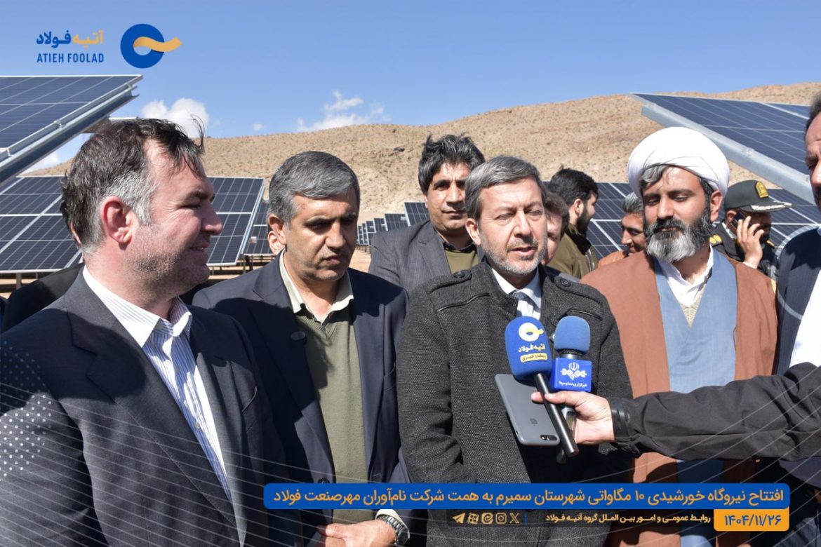 گروه سرمایه‌گذاری آتیه‌فولاد نقش‌جهان خبر از افتتاح رسمی نیروگاه خورشیدی ۱۰ مگاواتی در شهرستان سمیرم داد. مهدی جمالی‌نژاد، استاندار اصفهان و جمعی از مدیران صنعتی در این مراسم حضور یافتند. طهماسبی معاون بهره‌برداری گروه فولاد مبارکه و مهدی کویتی مدیرعامل گروه سرمایه‌گذاری آتیه‌فولاد نیز در این آیین شرکت کردند. محمد تاج‌میر ریاحی مدیرعامل هلدینگ فولاد متیل و سایر مسئولان محلی نیز شاهد آغاز به کار رسمی این پروژه بودند. مدیران پروژه مراحل فنی و اجرایی را با موفقیت پشت سر گذاشتند و نیروگاه را وارد فاز عملیاتی کردند.