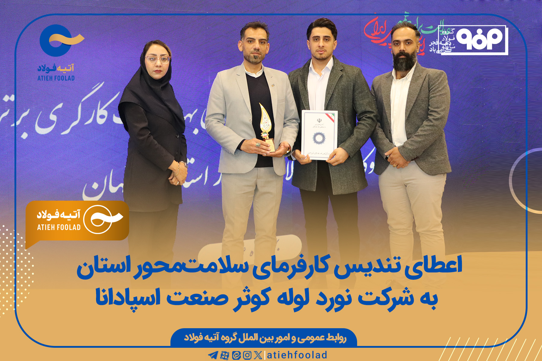 شرکت نورد لوله کوثر صنعت اسپادانا از زیرمجموعههای گروه آتیه فولاد، موفق به کسب تندیس «کارفرمای سلامتمحور استان اصفهان» در سال ۱۴۰۴ شد. این موفقیت در پانزدهمین جشنواره امتنان و در رقابت با ۵۳۹ واحد صنعتی استان به دست آمد که نشاندهنده تعهد این شرکت به ارتقای استانداردهای ایمنی و صیانت از نیروی انسانی است.