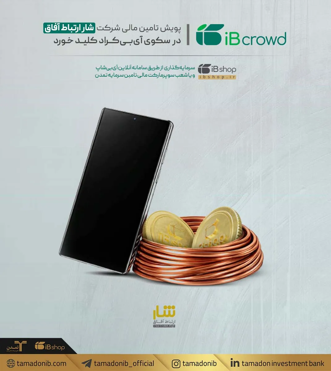 شرکت «شار ارتباط آفاق» برای جذب 250 میلیارد ریال سرمایه در گردش، پویش تامین مالی جدیدی را در سکوی آی‌بی‌کراد آغاز کرد. این طرح 12 ماهه با هدف خرید و فروش گوشی سامسونگ و سیم مسی اجرا می‌شود. برای سرمایه‌گذاران، سود علی‌الحساب سالانه 36 درصدی با پرداخت‌های فصلی در نظر گرفته شده است. کل این پویش برای اطمینان خاطر مشارکت‌کنندگان، دارای ضمانت‌نامه بانکی تعهد پرداخت است.