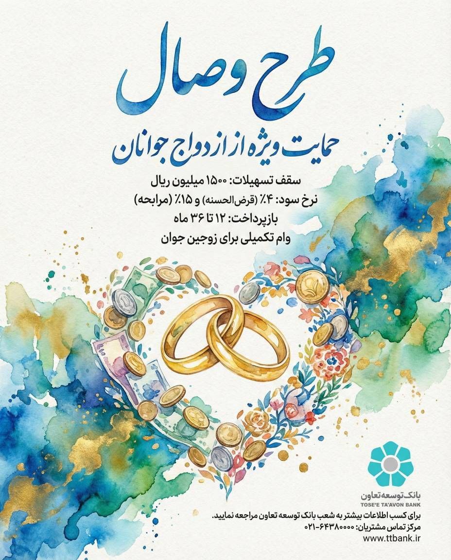 بانک توسعه تعاون طرح اعتباری جدیدی را برای حمایت مالی از زوجهای جوان رونمایی کرد. متقاضیان در قالب طرح وصال میتوانند تا سقف 1500 میلیون ریال وام تکمیلی دریافت کنند. این تسهیلات ویژه افرادی است که وام اصلی ازدواج خود را از همین بانک میگیرند. کارشناسان نرخ سود این اعتبار جدید را بین 4 تا 15 درصد تعیین کردند. وامگیرندگان بازپرداخت این مبالغ را در بازه زمانی 12 الی 36 ماهه انجام میدهند.