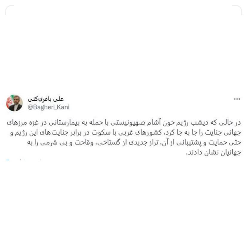 در حالی که دیشب رژیم خون آشام صهیونیستی با حمله به بیمارستانی در غزه مرزهای جهانی جنایت را جا به جا کرد، کشورهای غربی با سکوت در برابر جنایتهای این رژیم و حتی حمایت و پشتیبانی از آن، تراز جدیدی از گستاخی، وقاحت و بی شرمی را به جهانیان نشان دادند.