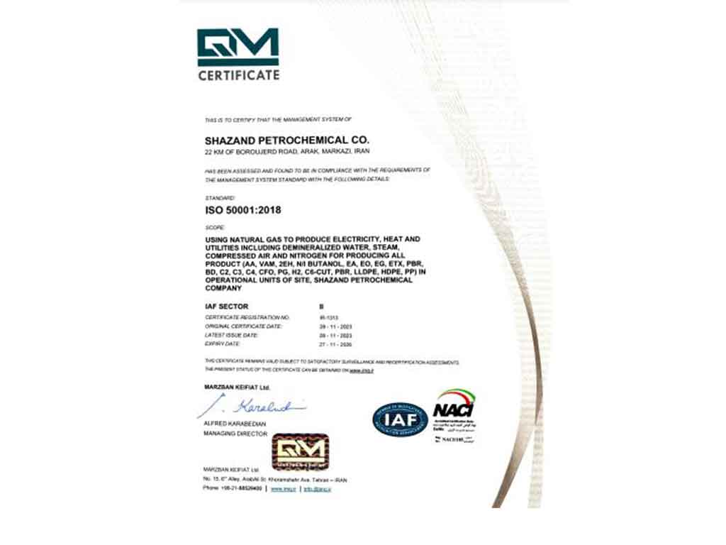 گواهینامه استاندارد مدیریت انرژی ISO 50001، ضمن اینکه منعکس کننده خط مشی مدیریت این سازمان و تلاش فراگیر در تمامی سطوح این سازمان برای افزایش بهرهبری انرژی و بهبود مستمر در زمینه کاهش هزینههای انرژی مصرفی به ازای واحد تولید میباشد، میتواند متضمن افزایش منافع سهامداران و نیز بصورت همزمان، کاهش آلایندگیهای ناشی از مصرف انرژی باشد. در کنار عواید ذکر شده، هرمیزان کاهش مصرف انرژی حاصل شده در پتروشیمی شازند، معادل افزایش عرضه همان مقدار انرژی به جامعه و هممیهنان خواهد بود.