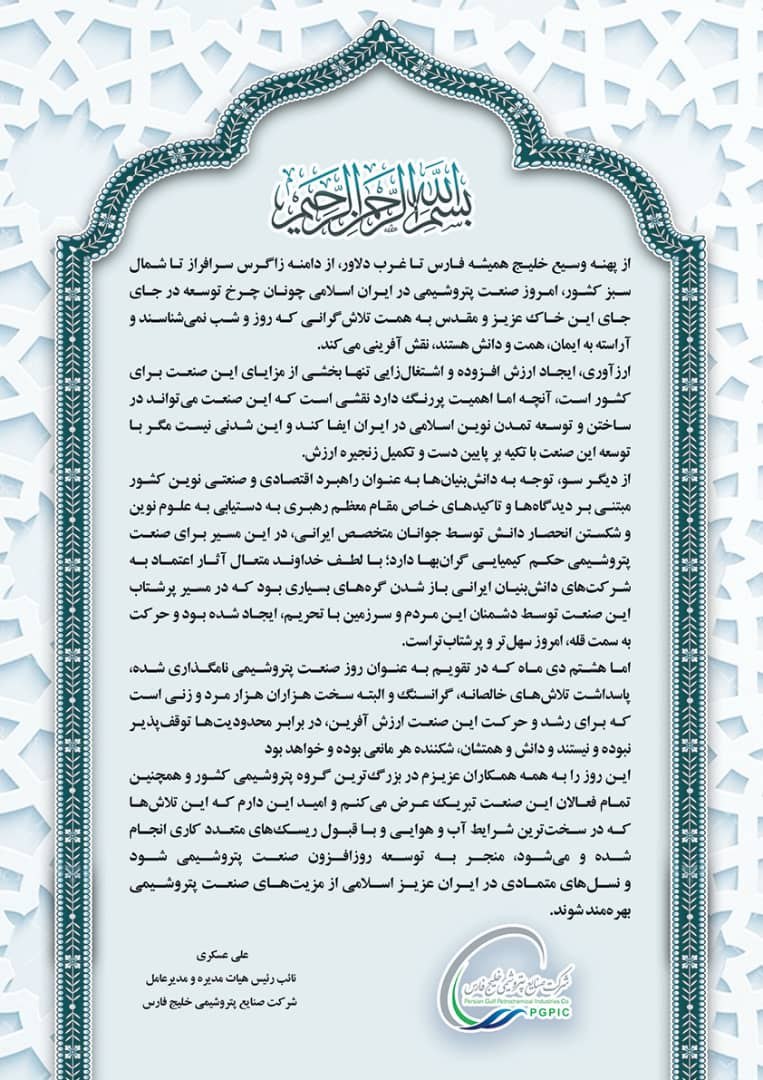 این روز را به همه همکاران عزیزم در بزرگترین گروه پتروشیمی کشور و همچنین تمام فعالان این صنعت تبریک عرض میکنم و امید این دارم که این تلاشها که در سختترین شرایط آب و هوایی و با قبول ریسکهای متعدد کاری انجام شده و میشود، منجر به توسعه روزافزون صنعت پتروشیمی شود و نسلهای متمادی در ایران عزیز اسلامی از مزیتهای صنعت پتروشیمی بهرهمند شوند.