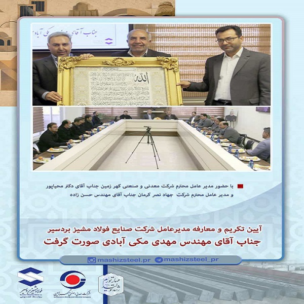 به گزارش روابط عمومی فولاد مشیز، در این مراسم، دکتر محیا پور مدیر عامل محترم شرکت معدنی و صنعتی گهر زمین پس از معرفی سوابق اجرایی جناب آقای مهندس مکی آبادی در منطقه گل گهر، بر لزوم ایجاد شرایط مناسب و فراهم کردن بسترهای فنی برای تداوم و استمرار تولید، و استارت هر چه سریعتر تولید در فولاد مشیز تأکید کردند.