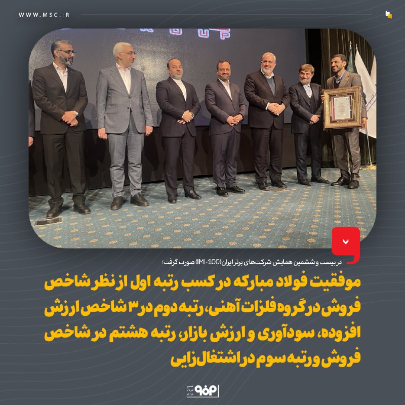 مطابق گزارش گروه کارشناسی رتبهبندی IMI-100 و براساس نتایج بهدستآمده از رتبهبندی سال ۱۴۰۲، شرکت فولاد مبارکه از میان ۵۰۰ شرکت بزرگ کشور، موفق به کسب رتبه اول از نظر شاخص فروش در گروه فلزات آهنی، رتبه دوم در ۳ شاخص ارزش افزوده، سودآوری و ارزش بازار، رتبه هشتم از نظر شاخص فروش و رتبه سوم اشتغالزایی گردید.