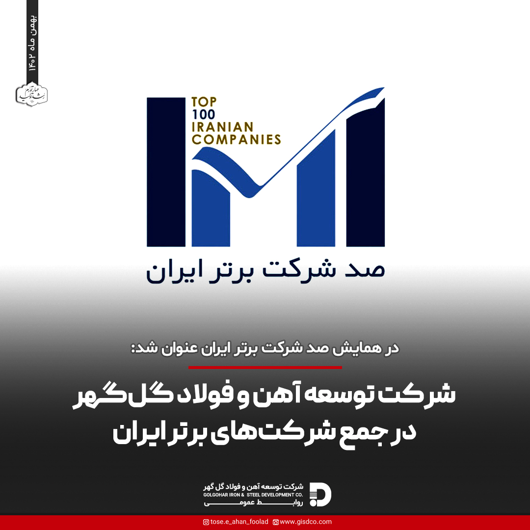 در این رویداد ملی و ارزیابی سازمان مدیریت صنعتی ایران مربوط به سال ۱۴۰۱ با عنوان معرفی صد شرکت برتر ایران، شرکت توسعه آهن و فولاد گلگهر توانست در گروه شرکتهای فلزات آهنی رتبه ۸ کشور را کسب کند و در بین پنجاه شرکت برتر کشور قرار گیرد.