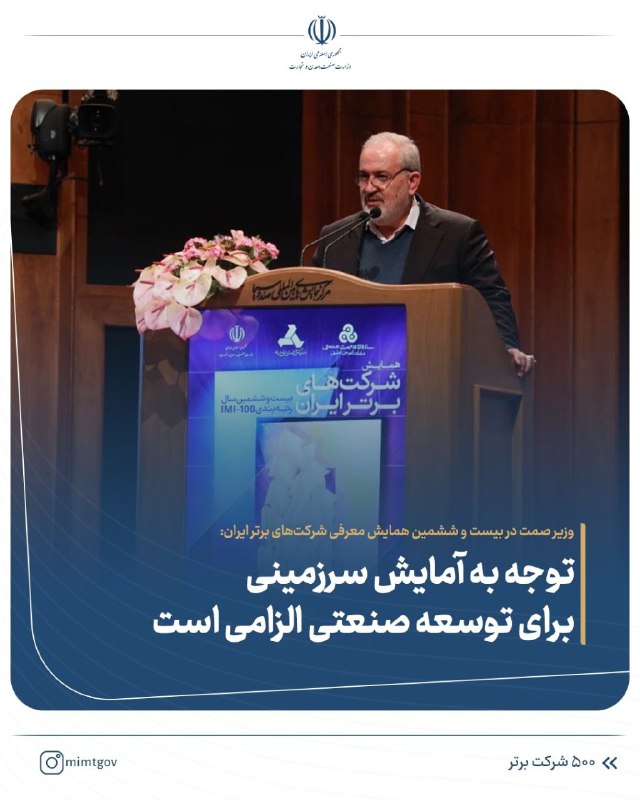 وزیر صنعت، معدن و تجارت در بیست و ششمین دوره همایش رتبه‌بندی شرکت‌های برتر ایران: طرح استعداد سنجی مناطق (آمایش سرزمین) برای توسعه صنعتی باید مورد توجه قرار گیرد و معاونت هماهنگی و محیط کسب و کار موظف است با مشارکت استان ها این کار را انجام دهد.
