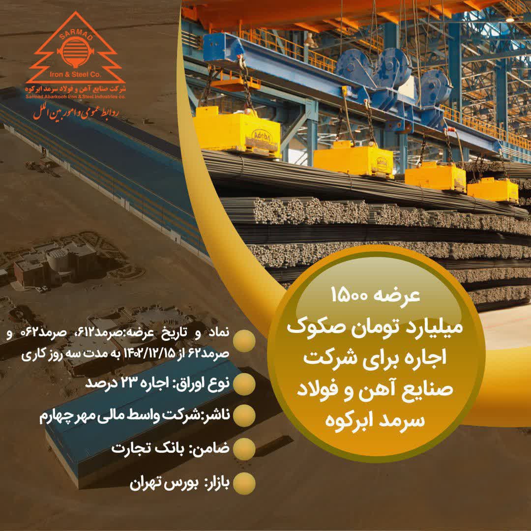 با مجوز سازمان بورس و اوراق بهادار، صکوک اجاره شرکت صنایع آهن و فولاد سرمد ابرکوه به مبلغ ۱۵۰۰ میلیارد تومان از طریق بورس تهران از روز سهشنبه مورخ 15/12/1402 به مدت سه روز کاری عرضه عمومی خواهد شد.
