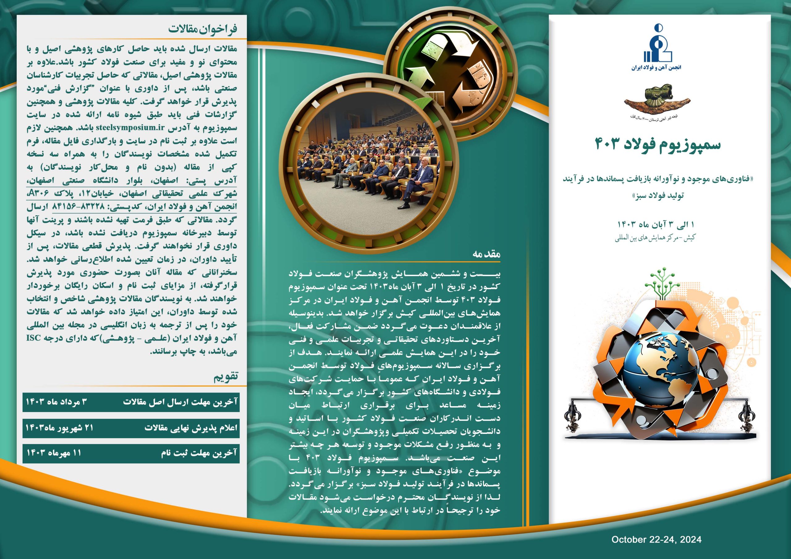 بیست و ششمین همــايش فولاد كشور تحت عنوان سمپوزیوم فولاد ۴۰۳ در تاریخ ۱ الی ۳ آبان ماه ۱۴۰۳ توسط انجمن آهن و فولاد ايران در مرکز همایشهای بینالمللی کیش برگزار خواهد شد. بدينوسيله از پژوهشگران، استادان دانشگاه، دانشجویان و متخصصین صنعت فولاد دعوت ميگردد آخرين دستاوردهاي تحقيقاتي و تجربی خود را در قالب مقاله، حتی المقدور مرتبط با شعار این همایش با عنوان ” *فناوریهای موجود و نوآورانه بازیافت پسماندها در فرآیند تولید فولاد سبز* “ طبق فرمت سمپوزیوم تهیه و پس از بارگذاری اصل مقاله در سایت سمپوزیوم به آدرس http://steelsymposium.ir/403 ، سه نسخه پرینت از مقاله بدون مشخصات نویسندگان به همراه فرم مشخصات نویسندگان را به آدرس دبیرخانه ارسال نمایند. در ضمن بروشور این همایش نیز پیوست میباشد.