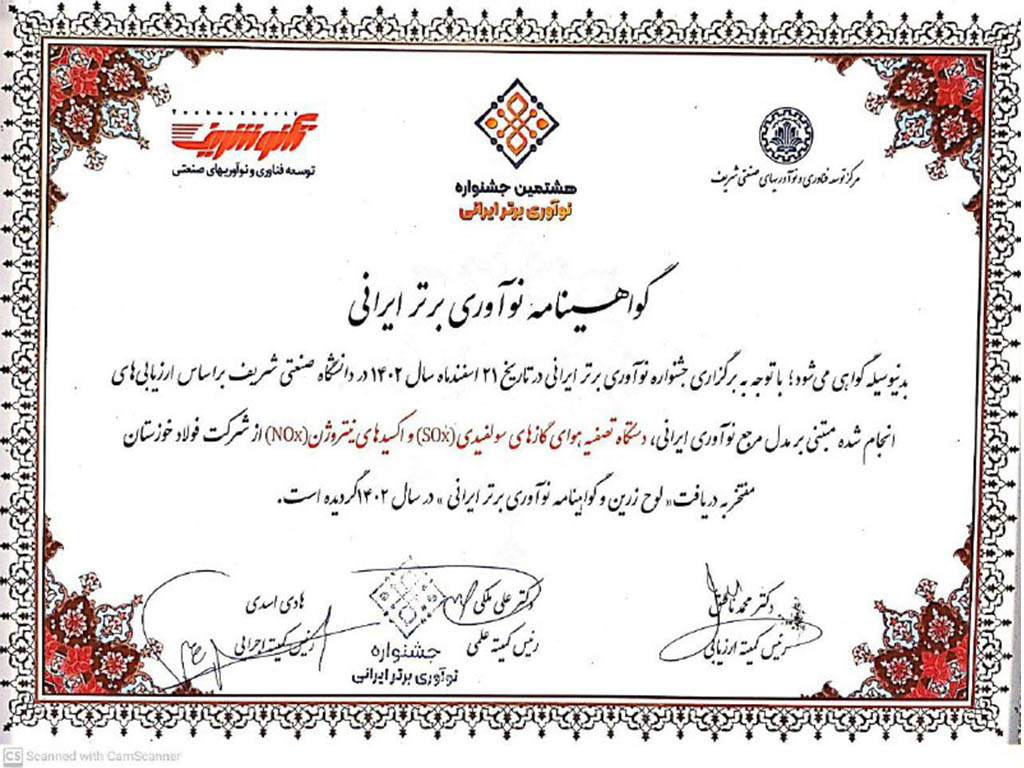 طاهر خاطر نشان کرد: این تندیس در یک ممیزی فشرده که ۱۸ بهمن ماه سال جاری صورت گرفت، برای اجرای پروژه نوآورانه بومی‌سازی دستگاه تصفیه گاز‌های سولفیدی، امتیاز حداکثری را به دلیل انجام تحقیقات سیستماتیک و غیر تصادفی دریافت نمود.