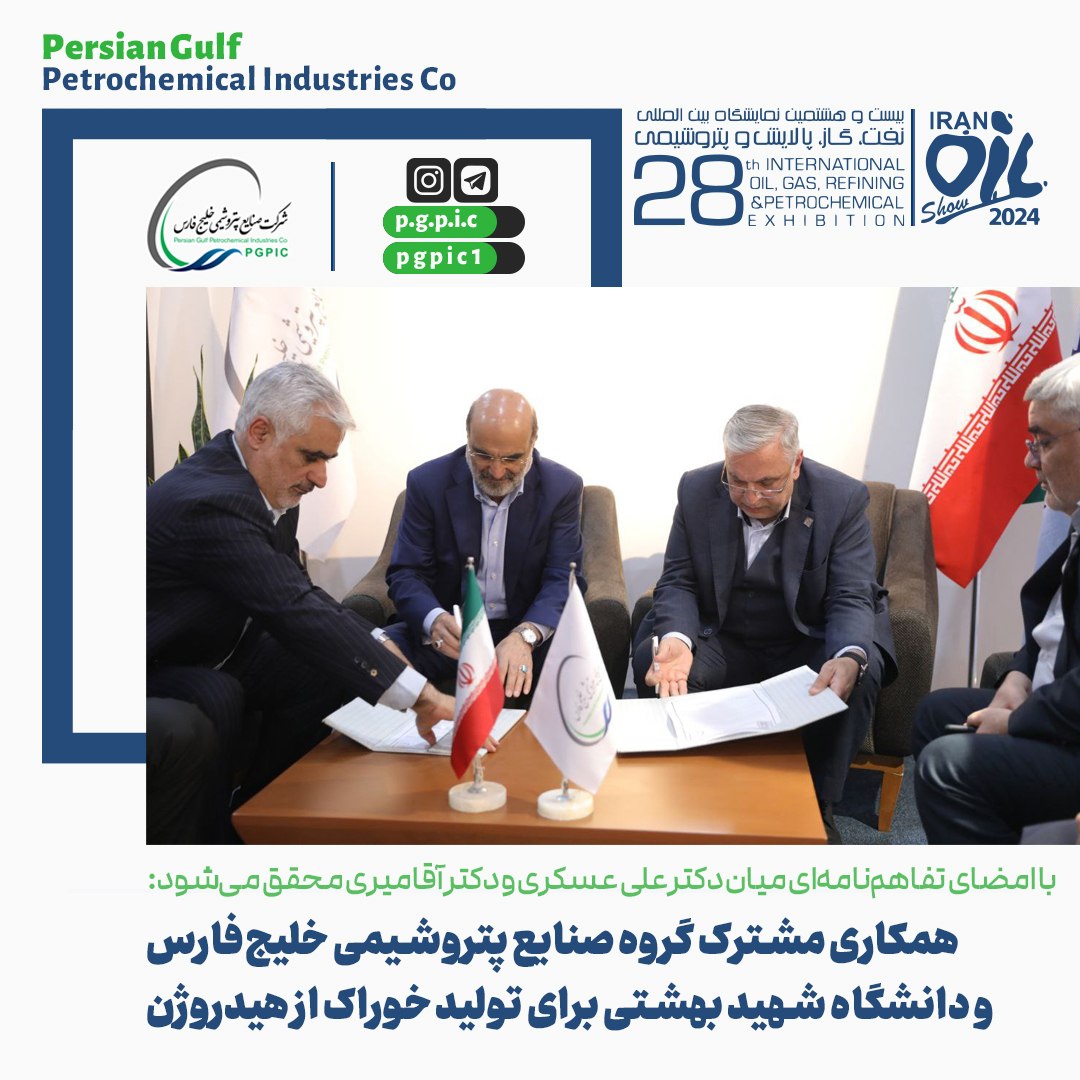در آخرین روز برگزاری نمایشگاه بینالمللی نفت، گاز، پالایش و پتروشیمی، با امضای تفاهمنامهای میان گروه صنایع پتروشیمی خلیجفارس و دانشگاه شهید بهشتی، بزرگترین هلدینگ پتروشیمی کشور گام عملیاتی مهمی بهسوی هدف تعیین شده تولید خوراک از هیدروژن برخواهد داشت.