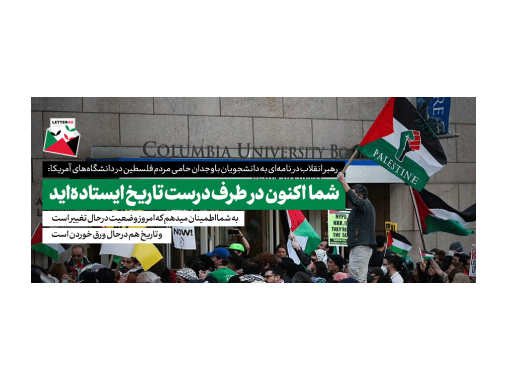 حضرت آیت‌الله خامنه‌ای رهبر معظم انقلاب اسلامی در نامه‌ای به دانشجویان حامی مردم فلسطین در دانشگاه‌های آمریکا، ضمن ابراز همدلی و همبستگی با اعتراضات ضدصهیونیستی این دانشجویان، آنان را بخشی از جبهه مقاومت دانستند و بر تغییر وضعیت و سرنوشت منطقه حساس غرب آسیا تأکید کردند.