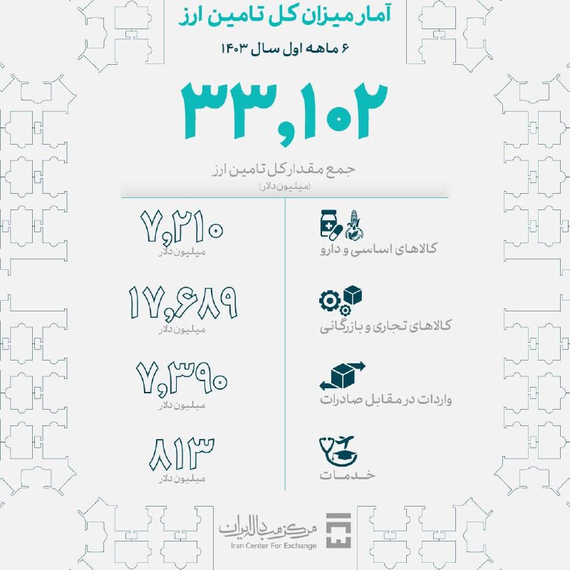 به گزارش مدیریت ارتباطات مرکز مبادله ایران، بانک مرکزی طی مدت مذکور، ۷ میلیارد و ۲۱۰ میلیون دلار برای واردات کالاهای اساسی و دارو تامین کرده است؛ از این مقدار، ۵ میلیارد و ۶۲۰ میلیون دلار به کالاهای اساسی و کشاورزی شامل گندم، دانه های روغنی و نهاده های دامی و یک میلیارد و ۵۹۰ میلیون دلار دیگر نیز به دارو، مواد اولیه دارو و تجهیزات پزشکی تخصیص داده شد.