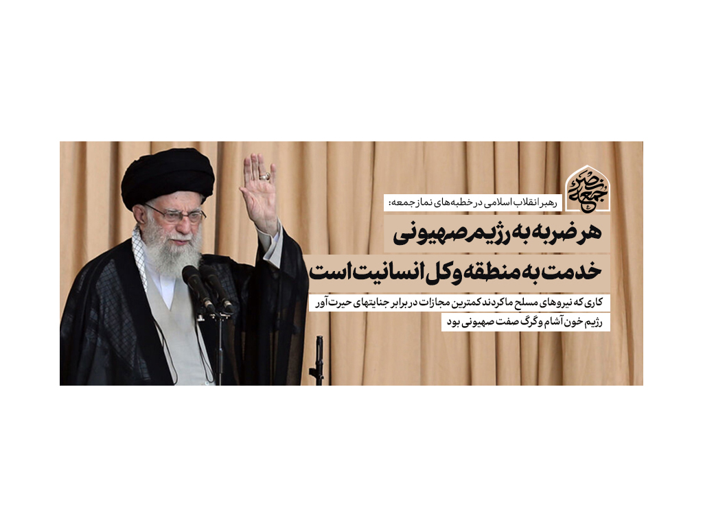 حضرت آیتالله خامنهای رهبر معظم انقلاب اسلامی در اجتماع عظیم و پر شکوه مردم در نماز عبادی- سیاسی جمعه تهران، اتحاد و همبستگی مسلمانان را موجب برخورداری از رحمت و عزت الهی و پیروزی بر دشمنان خواندند و تأکید کردند: بر اساس احکام دفاعی اسلام، قانون اساسی جمهوری اسلامی و قوانین بینالملل، کار درخشان نیروهای مسلح ایران در مجازات رژیم خونآشام صهیونیستی کاملاً قانونی و مشروع بود و جمهوری اسلامی هر وظیفهای در این زمینه احساس کند، بدون تعلل یا شتابزدگی، با قدرت و صلابت و قاطعیت انجام خواهد داد.