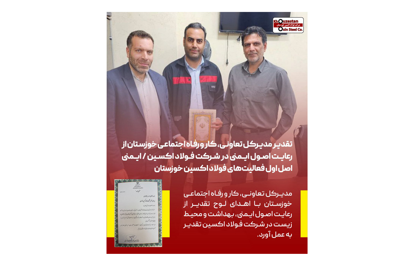 مجتبی ظفری پور مدیرکل تعاونی،کار و رفاه اجتماعی خوزستان از رعایت اصول ایمنی در شرکت فولاد اکسین با اهدای دو لوح تقدیر به علی محمدی مدیرعامل شرکت فولاد اکسین خوزستان و طاها عبیاتی رییس اداره ایمنی، بهداشت و محیط زیست این شرکت به پاس عملکرد شایسته و عالی در راستای اهداف عالیه حوزه ایمنی، بهداشت و محیط زیست تقدیر کرد.