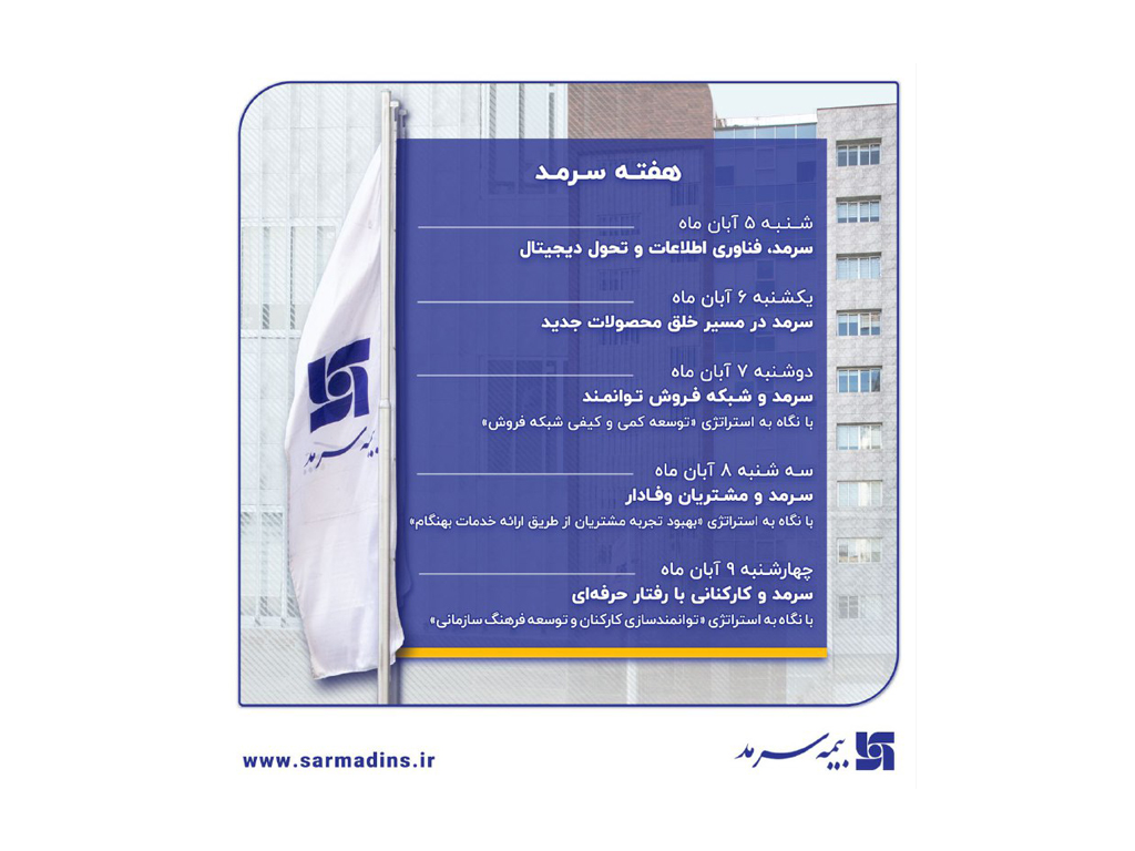 سه‌شنبه ۸ آبان ماه به مشتریان سرمد اختصاص دارد که با عنوان سرمد و مشتریان وفادار ضمن معرفی و تقدیر از مشتریان وفادار بیمه سرمد، از سامانه جدید ارتباط با مشتریان رونمایی خواهد شد.