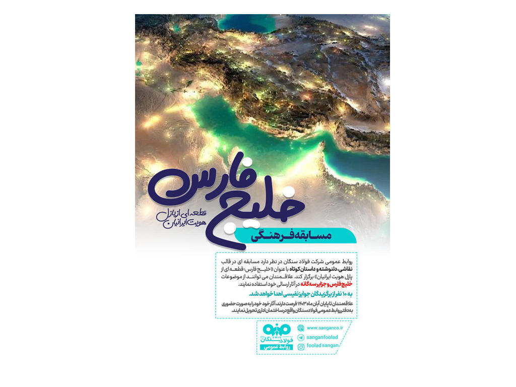 علاقـــمندان می تواننـــد از موضوعات خلیج فارس و جزایر سه گانه در آثار ارسالی خود استفاده و تا پایان آبان ماه 1403 فرصت دارند، آثارخود را به صورت حضوری به دفتر روابط عمومی فولاد سنگان،واقع در ساختمان اداری تحویل نمایند.