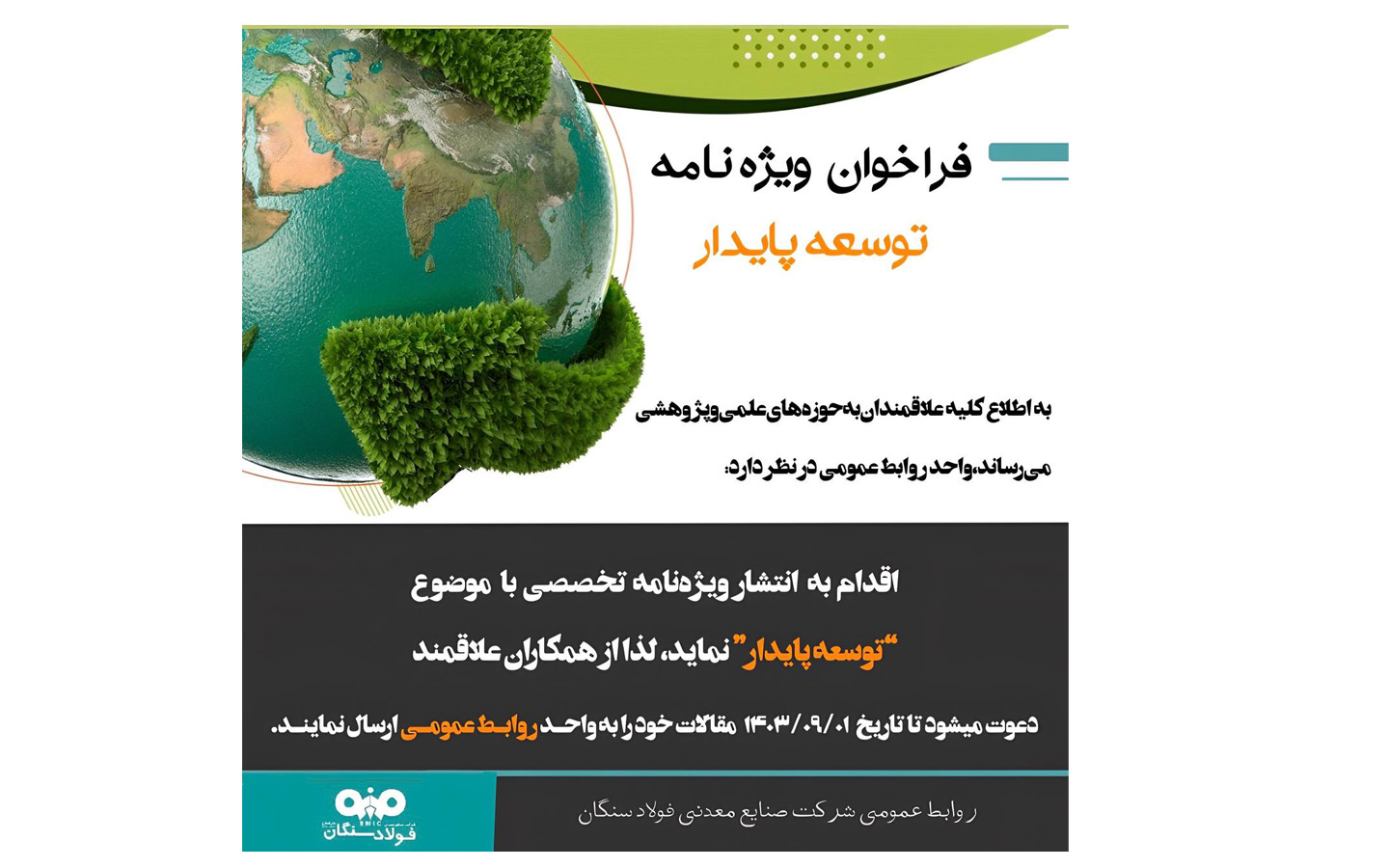 به اطلاع کلیه علاقمندان به حوزه های علمی و پژوهشی می رساند، واحد روابط عمومی در نظر دارد اقدام به انتشار ویژه نامه تخصصی با موضوع “ توسعه پایدار “ نماید، لذا از همکاران علاقمند دعوت می شود تا تاریخ ۱۴۰۳/۰۹/۰۱ مقالات خود را به واحد روابط عمومی ارسال نمایند.