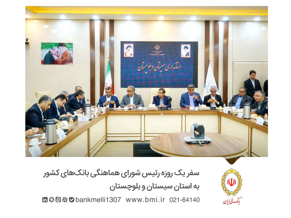 در این سفر مدیرعامل بانک ملی ایران ضمن ادای احترام به مقام شامخ شهداء و غبارروبی از مزار شهدای گمنام، در جلسه شورای هماهنگی بانک های استان که با حضور وزیر امور اقتصاد و دارایی، استاندار، نمایندگان شهرهای زاهدان، ایرانشهر، خاش و میرجاوه، چابهار و سوران، سرپرست گمرک کشور ، مدیران عامل بانک های کشور ، مدیران عضو کمیسیون هماهنگی بانک های استان و دیگر مسئولان برگزار شد به بررسی مشکلات بخش های تولیدی، صنعتی و اقتصادی ، ظرفیت های بخش تولید ، روند اجرای طرح های اقتصادی ، موانع سرمایه‌گذاری ، چالش های سیستم بانکی و ارائه راهکارهای بهبود شاخص های اقتصادی و توسعه پایدار در استان پرداختند.