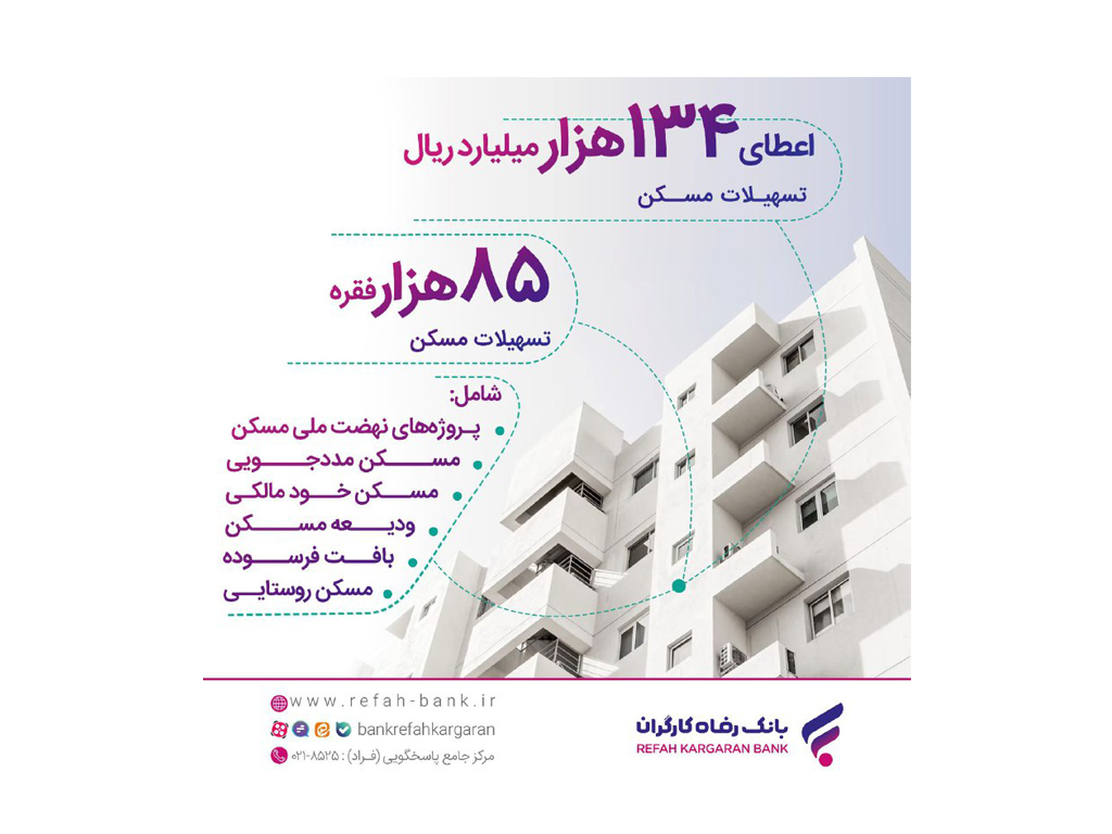 بانک رفاه کارگران از ابتدای اجرای قانون جهش تولید مسکن تاکنون بالغ بر 85 هزار فقره تسهیلات مسکن به مبلغ بیش از 134 هزار میلیارد ریال پرداخت کرده است.