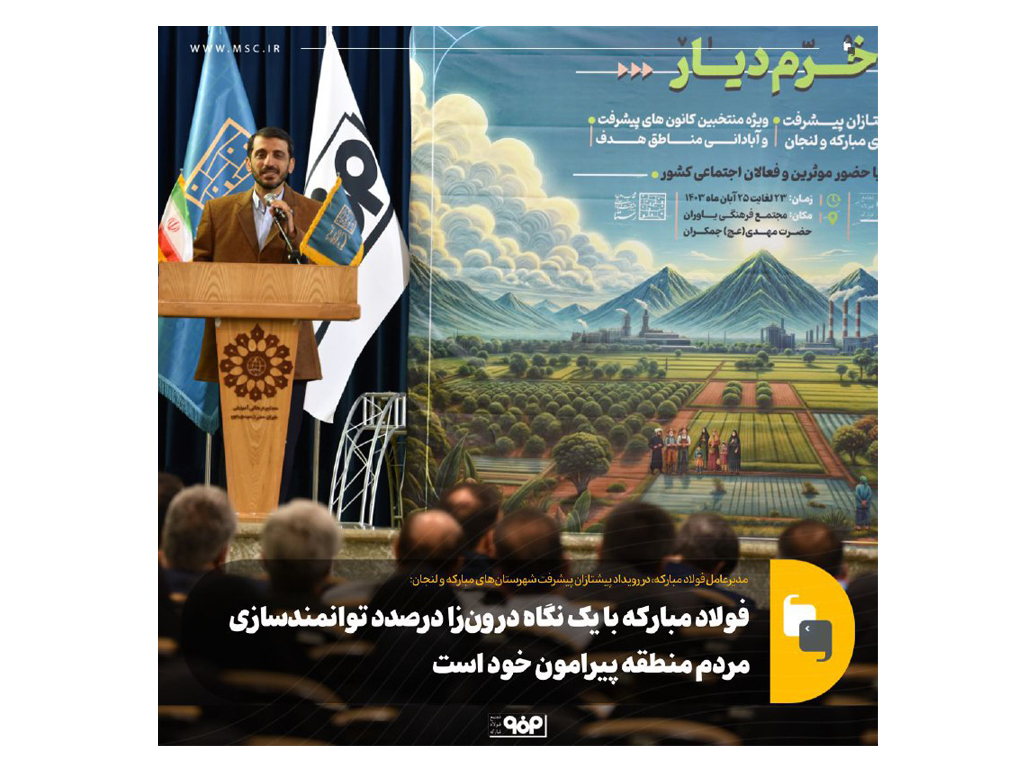 در راستای تحقق رویکردهای جدید فولاد مبارکه در حوزه مسئولیت‌های اجتماعی، رویداد پیشتازان پیشرفت شهرستان‌های مبارکه و لنجان، ویژه منتخبین کانون‌های پیشرفت و آبادانی مناطق هدف، با عنوان «خُرّم‌دیار» و با حضور موثرین و فعالان اجتماعی کشور، از ۲۳ آبان‌ماه در مجتمع فرهنگی یاوران حضرت مهدی (عج) جمکران آغاز و تا روز جمعه ۲۵ آبان‌ماه ادامه داش.