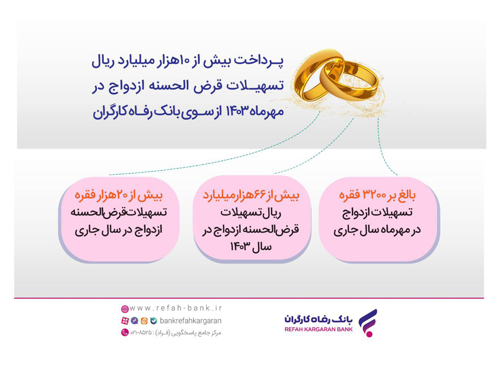 بانک رفاه کارگران در مهر ماه سال جاری بیش از 10 هزار میلیارد ریال تسهیلات قرضالحسنه ازدواج و تهیه جهیزیه پرداخت کرده است.