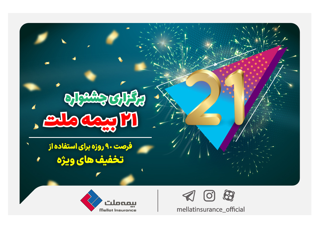 شرکت بیمه ملت به مناسبت بیست و یکمین سالگرد تأسیس خود، جشنواره ۲۱ را برگزار میکند. کلیه هموطنان عزیز میتوانند از مزایای جشنواره شامل تخفیفات ویژه برای صدور یا تمدید بیمهنامههای خود استفاده کنند. در این جشنواره بیمه ملت تخفیفات ویژهای در بیمههای آتش سوزی، حوادث انفرادی، مسئولیت و بدنه اتومبیل تخصیص داده است.