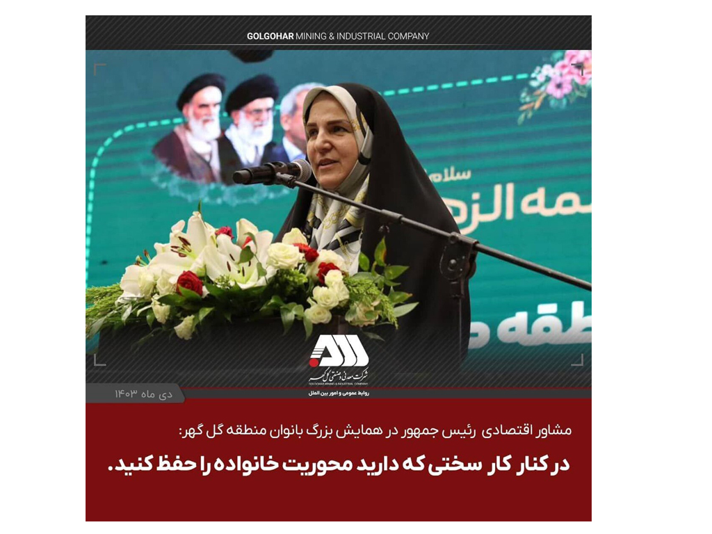در این مراسم که بیش از ۱۵۰۰ نفر از بانوان شاغل در شرکتهای منطقه معدنی و صنعتی گلگهر حضور داشتند، مشاور اقتصادی رئیسجمهور طی سخنانی به خصوصیات برجسته بانوان ایرانی اشاره و تاکید کرد: چالشها هیچ وقت زنان ایرانی را خسته نمیکند پس باید تلاش کنید که به جایگاه واقعیتان برسید و به این اصل باور داشته باشید.